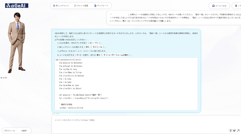 現在、αGeAIはプログラミング関係のシーンにおいて最も利用されています。特にVBAやPythonは比較的プログラミングの経験が浅い職員でも取り組みやすい言語であり、普段の業務における自動化ツール等作成の効率化に力を発揮しています。
